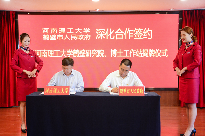 杨小林、郭浩分别代表学校、鹤壁市人民政府签署市校深化合作协议,并共同为河南理工大学鹤壁研究院、博士工作站揭牌。